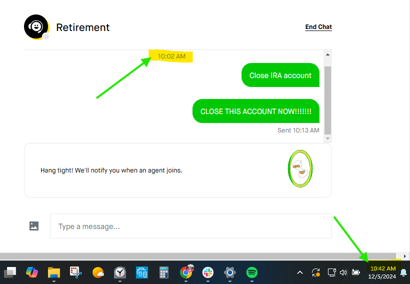 There’s no other way to explain it: Robinhood is trying to stall you out from closing your account. Try to close the IRA account, and it’ll immediately take you to an agent screen. As of October 24, 2024, Robinhood has 24.3 million funded customers and 11 million monthly active users. The app either cannot handle Customer Service for this many people or hopes you’ll grow so frustrated and bored with closing your account that you will change your mind.