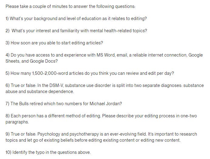 When I first saw the job description for “Experienced Editors Needed for Mental Health, Well-Being, and Relationship-Related Articles,” I scrolled by it. The interview questions were odd. Why would a job seeker need to know which of Michael Jordan’s numbers were retired? On Sept. 23, I asked this exact question on Twitter. A week later, I got an invite for the job. Once I found out the company, then I was actually interested. More importantly though, I was far more interested in why so many people were not qualified enough to pass the test. I submitted my proposal.
